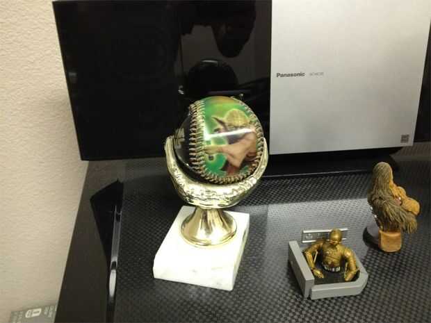 Apagado en la esquina una pequeña nevera repleta de Dr. Pepper y Mountain Dew (y pocos).  Personas sientan por la estrella de la muerte, abierto el frig y tomar una copa en la parte superior el frig varios mini-Bustos, así como mi favorito béisbol de Star Wars. Consigue un montón de miradas.