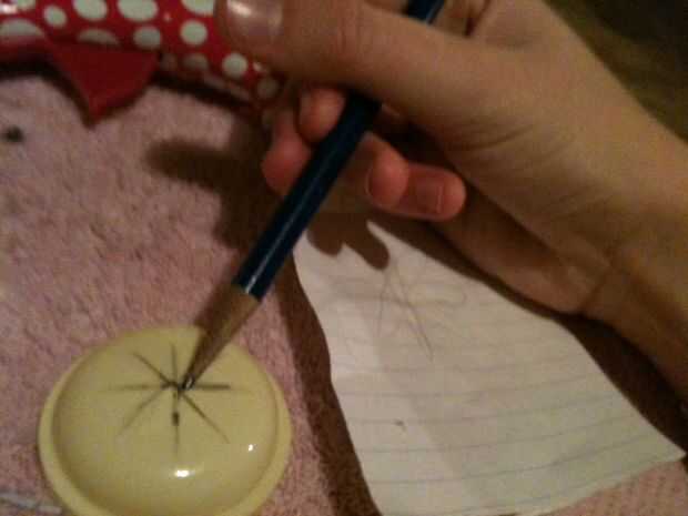 Para empezar, subir con el diseño de la estampilla que desea. Si es para Navidad, se podría hacer un copo de nieve, como el mío. Si es para un cumpleaños, se podría hacer una imagen de la torta. Dibujar lo que quieres hacer sobre un pedazo de papel como guía. Entonces, ligeramente bosquejo sobre la tapa del envase de su diseño.