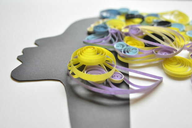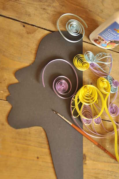 Aplique el pegamento líquido para pegar las formas juntas. Es mejor utilizar el pincel fino o un palillo. Mi consejo para unir todas las formas y luego pegar todo en la silueta, para evitar a superficie sucia de silueta. Es divertido superponer las formas para acentuar el efecto 3d