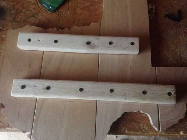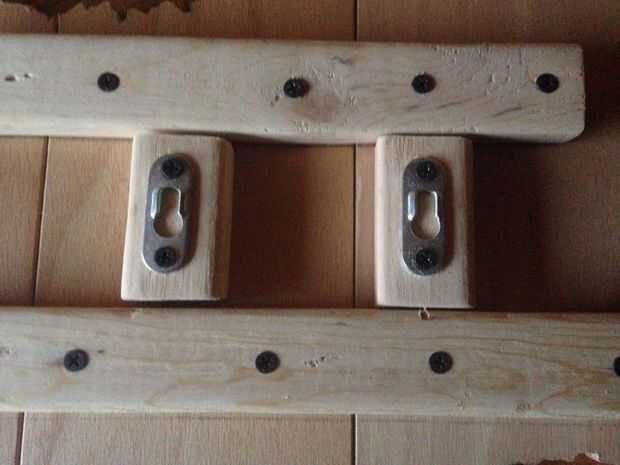 solía algunas pequeñas tiras de madera en la parte posterior de las tablas de apoyo de juntos. Las que usé 1x2s y los tornillos de 1 1/4 in. Comencé por averiguar donde encajaría mejor en la parte posterior. Luego recorto y lija para ser más suave. Yo les había alineado y había atornillado abajo preparando los tablones juntos. Los soportes de suspensión que tenía no encajaban en las llaves, así que tuve que agregar dos más pequeños pedazos de madera para montar. Yo debo han utilizado un tipo de soporte diferente pero estos fueron lo que tenía.