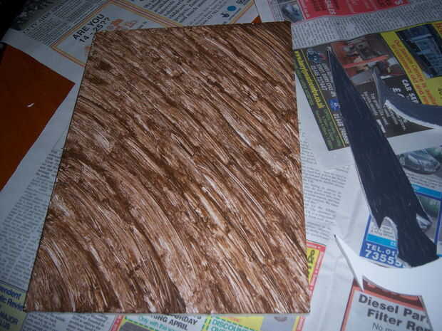 7. Utilice una hoja de la espuma que utiliza para las otras plantillas para crear un tablero para la arma. Esto puede ser un cuadrado, un rectángulo, elipse (oval) o cualquier forma que desee. Utilizar las pinturas de acrílico para pintar el tablero parece de un material específico en mi caso de madera para el look clásico de skyrim. Otro material que podría hacer sería metal. (Un Consejo para pintar un material para que parezca madera es obtener un tono de marrón que te gusta y el material en solo trazos, su clave no para hacer este respaldo sólo sólido de pintura marrón, no ves como la madera)