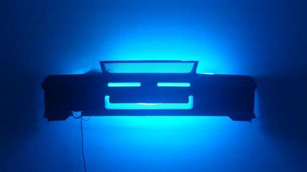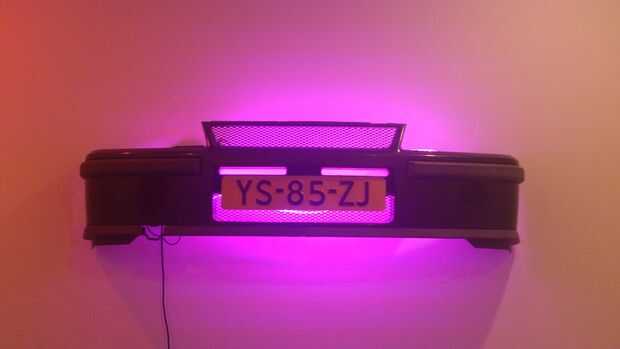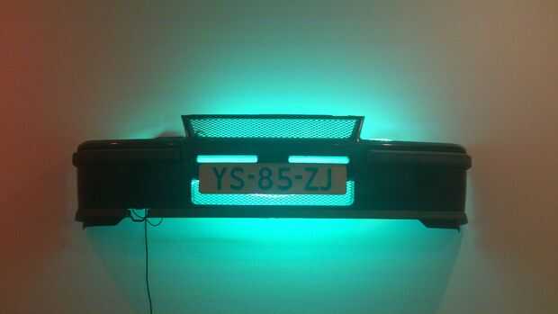 Después de colocar las tablas en el parachoques y colocar estante de libro apoyan a las tablas, era fácil de poner en la pared de la misma manera que lo haría con un estante. Después de eso equipado negro mallas en las aberturas. Para hacerlo realmente destacan dispone de una led-tira RGB con control remoto. La placa del número vino el primer coche que me senté en eso es un detalle bonito así.
