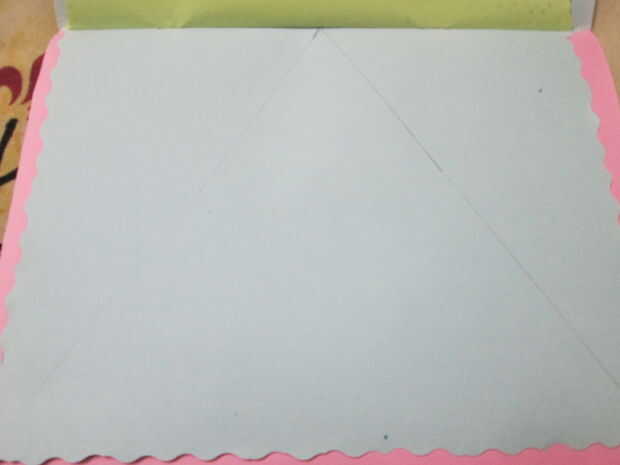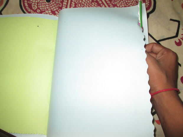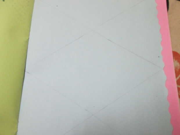 1 ahora amablemente toma tu libro de recuerdos y abrir cualquier página. 2 reducir el límite de página con tijera de corte zig zag. 3.Ahora haga un triangulo que une dos ángulos del mismo lado. (como en la imagen) 4. del mismo modo hacer otro con dos esquinas.