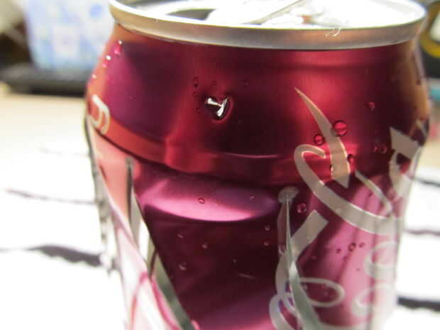 2. usando el cúter o navaja de afeitar, pop 4 pequeños agujeros en la parte superior de la lata en 4 lados opuestos para el hilo de alambre que se encadenan a través de. Utilizando un trozo de hilo, en la longitud que usted desea, enhebrar el hilo en el agujero y el agujero en el otro lado de la secuencia. Repetir este proceso con otra cadena de la misma longitud. Unir las 4 puntas por encima de las latas para ser usado para colgar la lata.