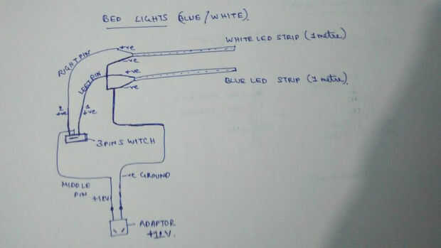 3. 1 cable del borne positivo de la tira del LED fue unido al pin 1 extremo del interruptor de 3 vías.