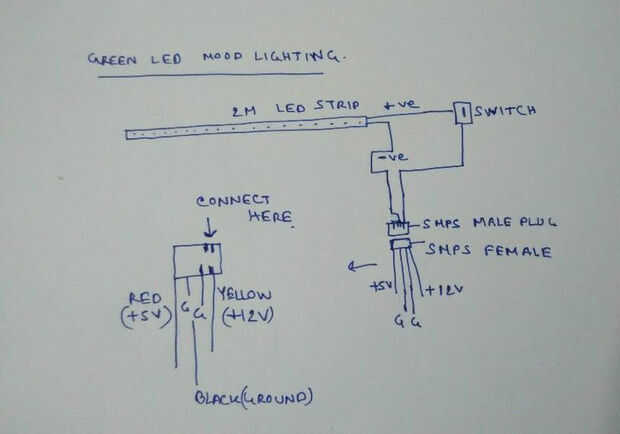3. lo positivo entonces fue conectado a un switch que luego fue conectado con el cable de 12v amarillo de una cpu de SMPS. Se da el código de color.
