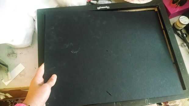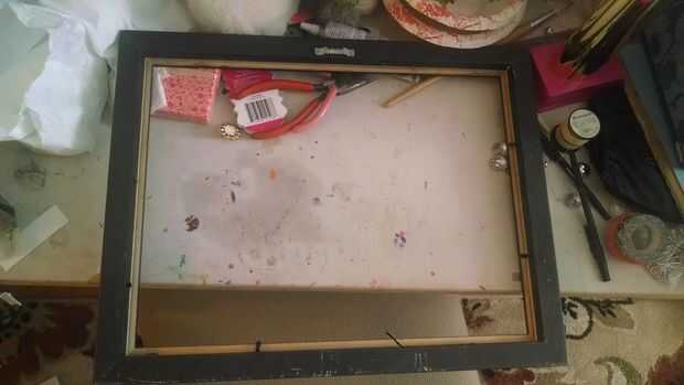 El primer paso es quitar el cristal y cualquier imagen estaba dentro. Porque los caracoles son tres dimensiones, sobresalen demasiado por el vidrio encajar. Mi marco no tenía un soporte en la parte trasera, en cambio, era sólo un pedazo de cartón negro. Si el marco no tiene algo como eso, uso la cartulina y pinte cualquier color que desee. Una vez que esté listo, poner la cartulina en el marco.