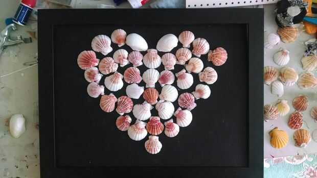 Recoger sus conchas y ponen hacia fuera en la forma o patrón deseado. Elegí un corazón como la forma que quiero. Una vez que estés satisfecho con tu diseño, use la pistola de pegamento caliente para pegar las conchas hacia abajo. Si hay cualquier sobra pegamento fibroso palmeada sobre las conchas, pelar.