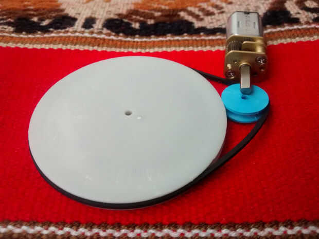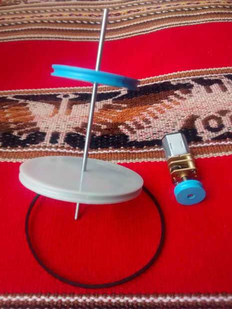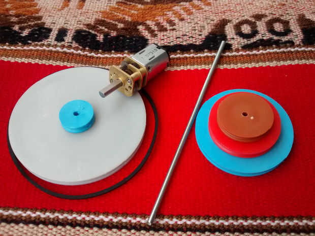 El motorreductor tenemos gira relativamente rápido y tenemos que reducir su velocidad. Para conseguirlo utilizamos 2 poleas; la polea de 1cm de diámetro gira con el motorreductor y, a través de la goma elástica, rotación de las transferencias a la polea de diámetro 5cm, que reduce la velocidad de su eje.