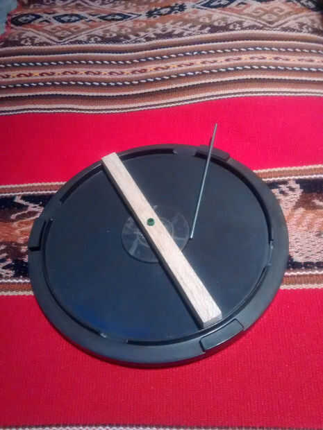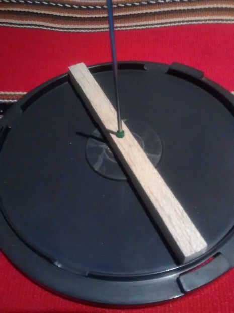 Colocar la madera de balsa horizontalmente y en el punto central de base. Hacer un agujero en la madera de balsa e inserte allí alrededor de 1,5 cm de la palanca de paleta. Tal agujero de palo realizará el eje en posición vertical mientras sigue permitiendo que gire con baja fricción. Pegar la madera de balsa a la base con pegamento caliente del derretimiento, pero no pega el palillo del lollipop de la madera de balsa, ya que puede necesitar ajustar luego.