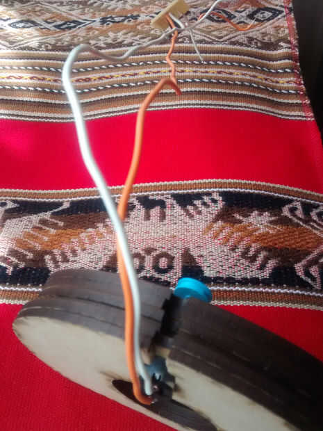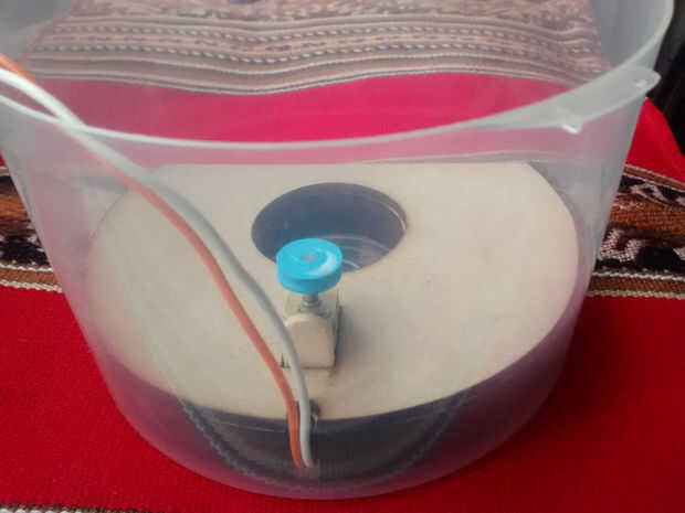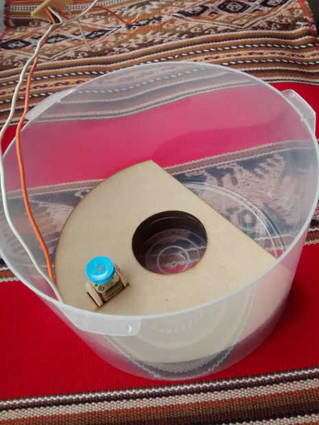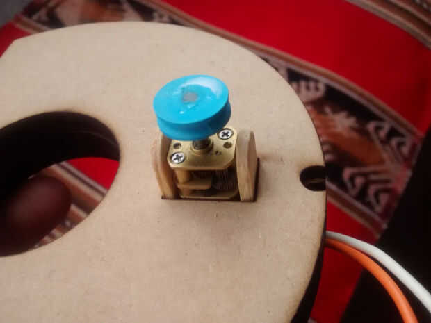 Diseñamos algunas capas de MDF para mantener el motor en posición vertical y deje suficiente espacio para el eje principal y el Arduino. Además, un pequeño orificio permite conectarlo en el circuito. Puede que necesite poner dos piezas de un palito alrededor del motor para hacerlo más estable. Si haces eso, cuidado con obstruir la polea unida al motor.