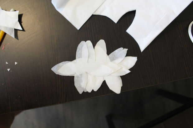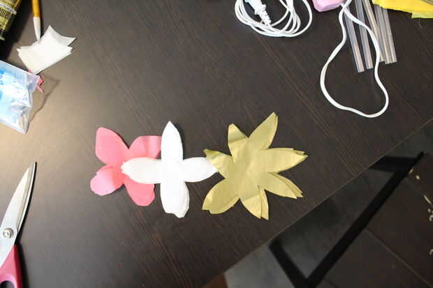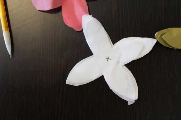 Tip: Plegar el papel por lo que eres capaz de cortar varias flores cada vez, en lugar de dibujar y cortar cada flor individual. Esta le ahorrará tiempo y se asegurará de que las flores tengan el mismo aspecto. Cortar flores de 15-20.