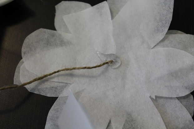 Paso 1: Coloque cuidadosamente una gota de pegamento caliente en el centro de la flor, cerca de la cadena. Esto asegura que las flores no moverse o deslizarse una vez que su proyecto es colgar.