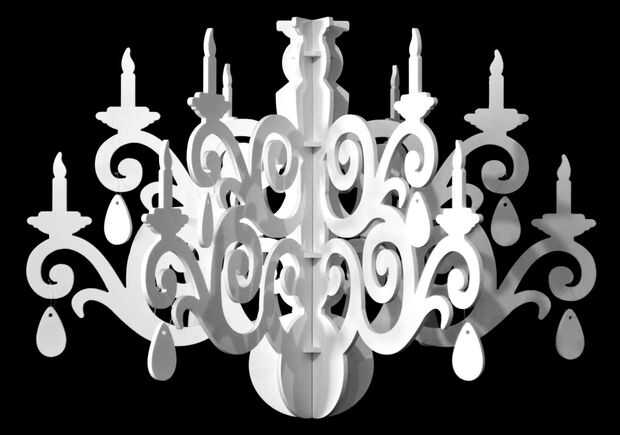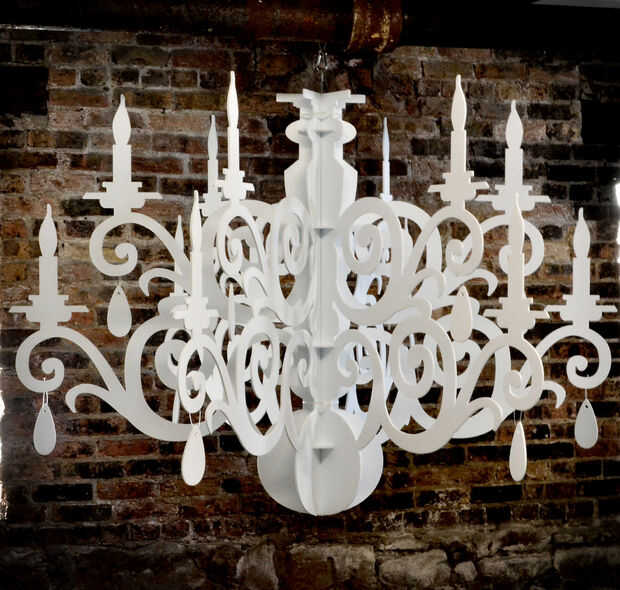 Como creativo freelance, a menudo diseño ambientes temáticos para eventos especiales. Lámparas grandes son caras (como un alquiler) y son sumamente complicados de transporte o montan. He desarrollado esta solución que crea una casi seis pies de ancho , lámpara visualmente substancial que pesa menos de 13 libras y los planos y en sólo la mitad del diámetro. Me ha gustado las simples líneas de lámparas de araña que había visto en utilizado en diseños modernos en hoteles y salones urbanos. Esta lámpara versátil incluso puede electrified bastante fácilmente. Estos son principalmente populares en blanco o negro, pero se pueden cortar de otros productos de tablero se pueden enrutar como láminas de plástico PVC o acrílico incluso.