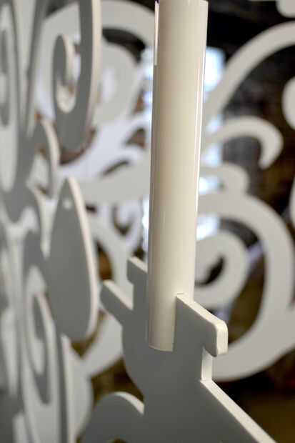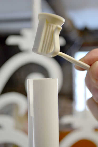 Cortar doce sección 4-5 pulgadas de tubo de 1" para actuar como las velas. Cortar un aproximadamente 1" de profundidad de la muesca a través del tubo para asegurar en su lugar en la silueta de Junta de espuma. Pegamento caliente permanentemente puede fijarlos fácilmente. Corte una muesca más en el extremo opuesto del tubo, perpendicular al primero para permitir que el cable de la lámpara y toma asiento correctamente.