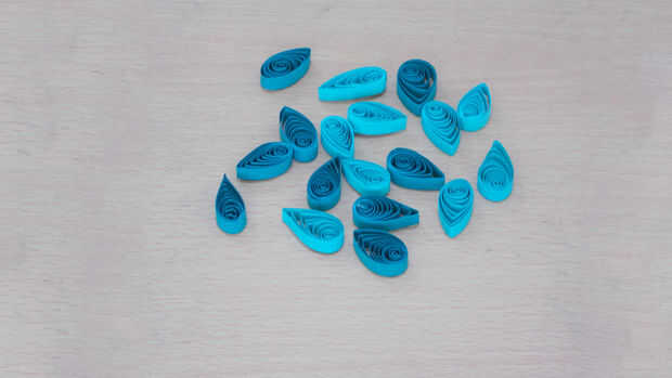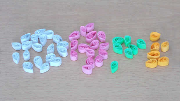 Tomar un rosado quilling tira y con la ayuda de una aguja quilling hacer una bobina cerrada. Darle la forma de una lágrima y hacer múltiples lágrima caer en forma de bobinas en los colores del cielo azul, cian, rosa bebé y azafrán.