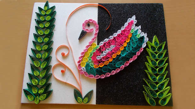A 2 tiras de quilling de color verde oscuro y color verde sap, formando una bobina cerrada. Afloje un poco y darle la forma de una hoja por estrechamiento de uno de los extremos. Hacer múltiples hojas combinando distintos tonos de verde.