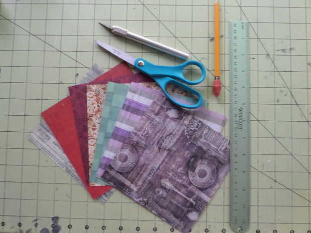 1) una pieza de 12 x 12, peso mediano, papel decorativo doble cara. El peso es importante. Si lo desea, pero este cuadro requiere que sea un poco más robusto, puede utilizar papel de computadora regular. Si utilizas papel pesado, va ser difícil doblar en este tamaño, no sólo podría quebrarse en los pliegues. Puede experimentar con el papel de lo que te gusta y si funciona sin agrietarse la imagen, luego ir a por ello. No sé mucho sobre el papel de scrapbooking, pero puedo decirte que la marca gráfica 45 se agrietará en los pliegues y tiene líneas blancas feas donde los pliegues son.