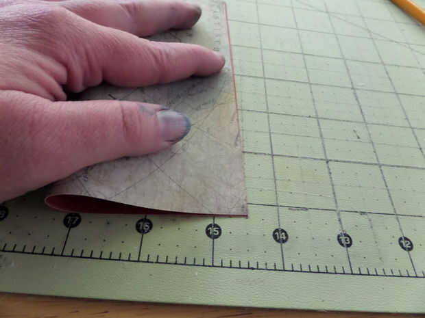 2) ahora, doble punto a punto, o sobre la línea diagonal. Hacerlo en ambas direcciones. Cuando se abre (otra vez con el lado interior o rojo frente a usted) debería ver 4 cuartos todos con un pliegue diagonal en él.