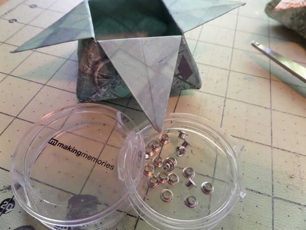 Tengo un setter de ojal que se utiliza normalmente para la tela, pero no es lo suficientemente pequeño. He experimentado en mi caja de chatarra y encontró que el mecanismo que se construye en perforación es apenas un poco más grande que el agujero del ojete, así que tuve que ir con el organismo de martillo tradicional. Bummer.