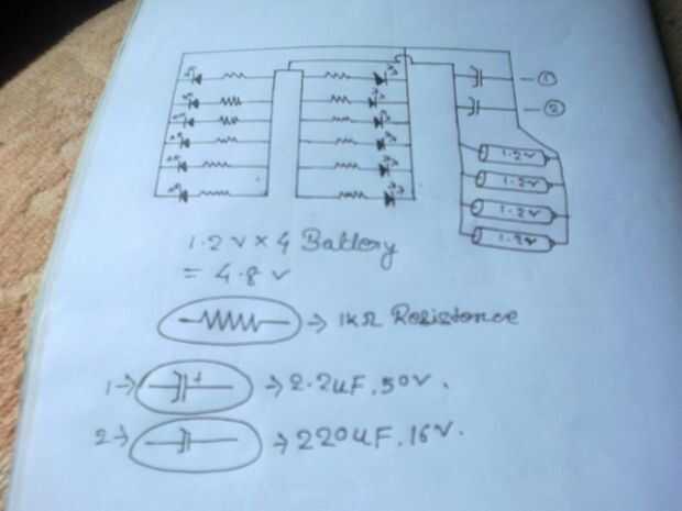 Después de algún tiempo finalmente no tengo una idea y diseño 12 LED circuito paralelo pero el problema sigue encendido, cuando organizar los LEDs en el tablero de montaje hay suficiente espacio para la resistencia, pero después de algún tiempo encontré una manera de resolver el problema, solar cada resistencia con perno de ánodo del LED, después de hacer esta curva un poco la resistencia perno de la que hacen un centro punto de soldadura. Utilicé una cerámica gruesa cobre soldar y después de todo esto había sido soldado permanentemente, pero el problema aún en con el punto del cátodo del LED. Utilicé un alambre aislado con el aislamiento del corte según el punto cátodo como el LED situado.