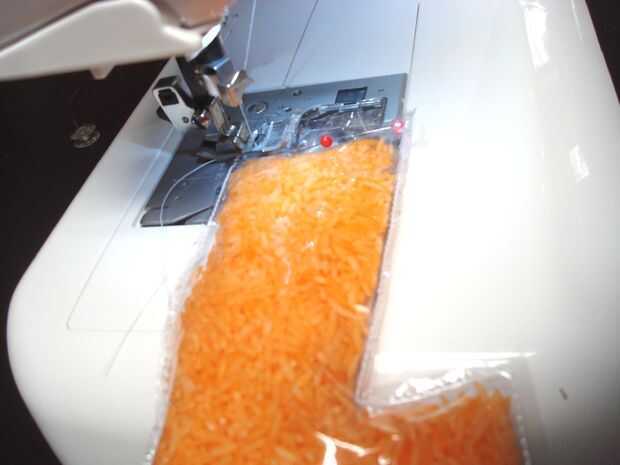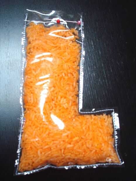 Use una cuchara a cuchara de arroz en la decoración de la tela de vinilo.  Una vez que se llena de arroz añadir alfileres en la parte superior de la decoración para asegurarse de que no hay arroz viene hacia fuera y coser la abertura con la máquina de coser.