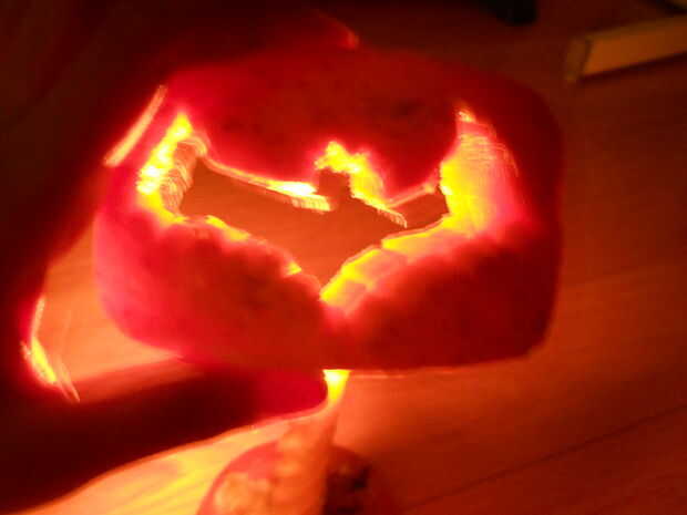 este año para Halloween hice una gato-o-linterna que sopla vapor de agua de hielo seco. Un amigo me dio la vuelta a http://www.pumpkingutter.com. Pensé que era increíble pero pensé que era mucho más allá de mis capacidades artísticamente hablando. En