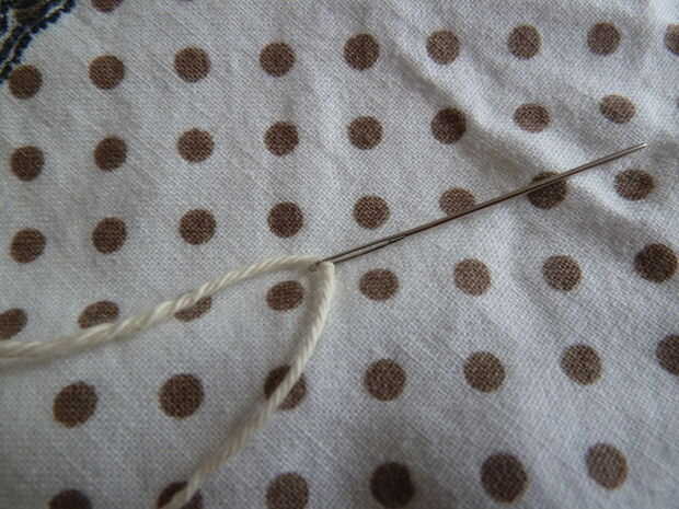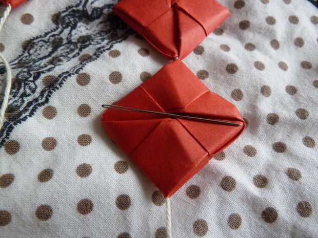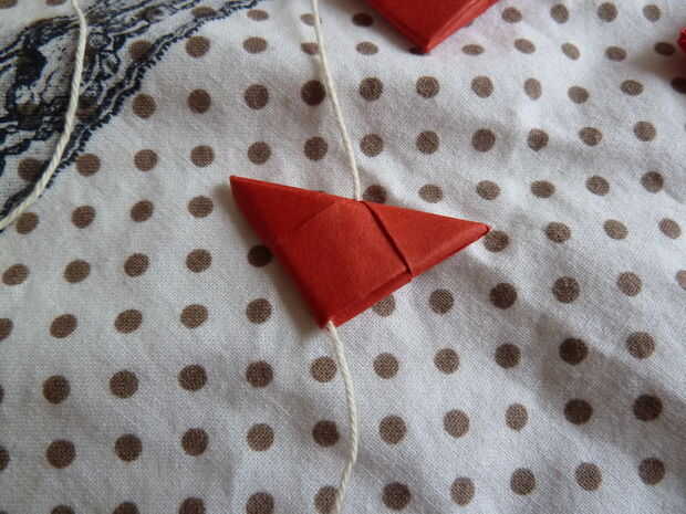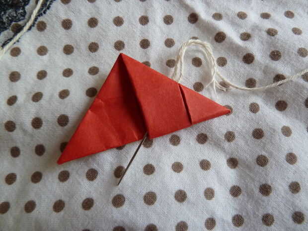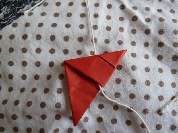 Por suerte, nadie consiguió daño esta vez. Con su aguja, hacer un agujero en el centro de su triángulo, en la parte superior. Dejar el hilo a través de allí primero, después que sólo puede añadir los cuadrados debajo de ella utilizando la misma técnica que en los últimos pasos.