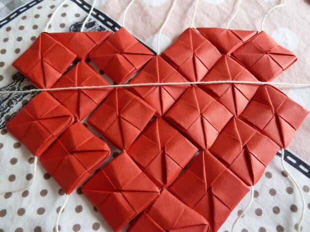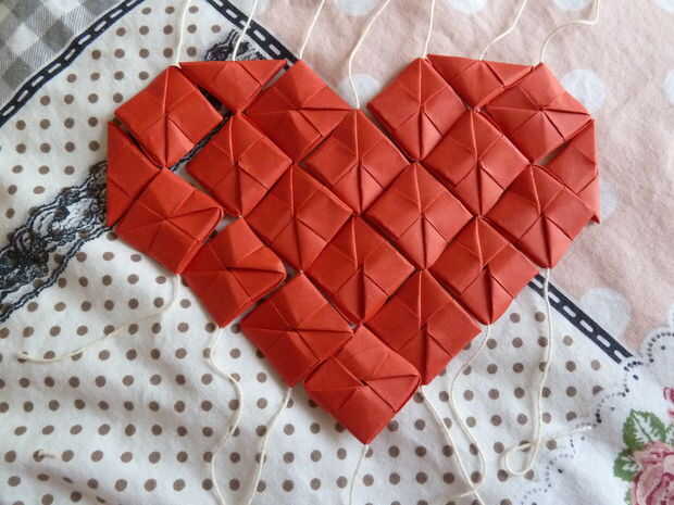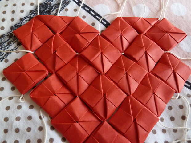 Básicamente es el mismo que el paso anterior, pero ahora tienes que trabajar con el corazón como una forma total en lugar de sólo las filas. Hay cinco filas para unirse a esta forma, empecé con el que tiene los triángulos en los lados. Pero me salté los triángulos primero, ya hace el trabajo en esta fila mucho más fácil. Abrir los tres (en este caso) plazas, añadir el hilo y vuelva a cerrar.