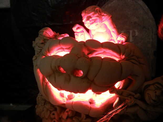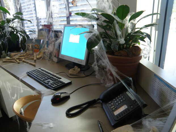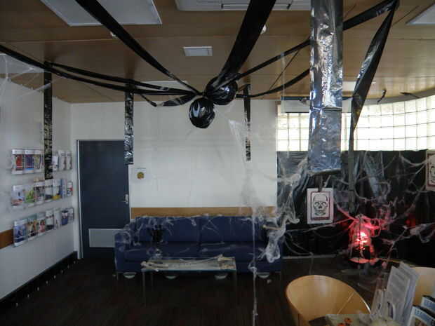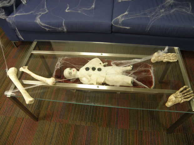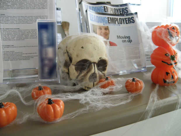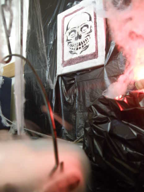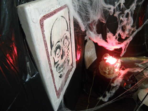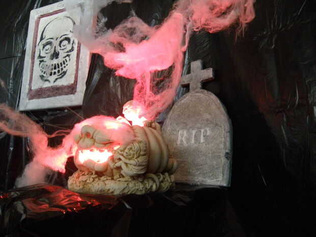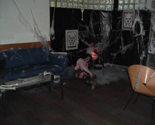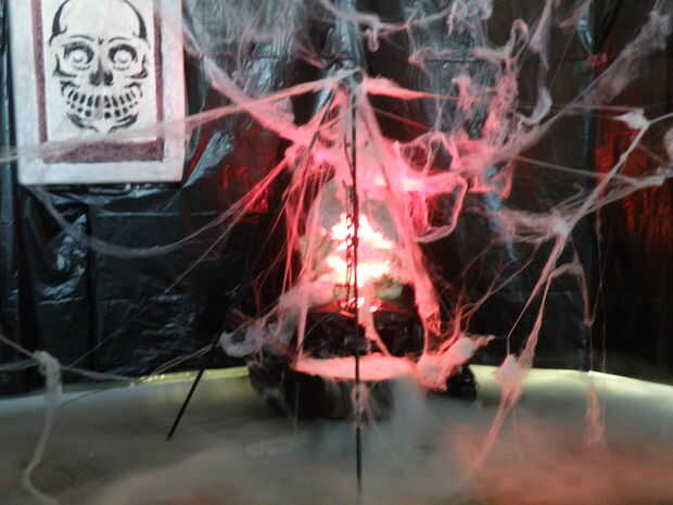 Esta es la zona de mostrador (recepción) en el campus de la Universidad donde trabajo. Halloween no es generalmente un gran problema en Australia, pero pensábamos que tendríamos un buen rato el año pasado. Hay un carro de zombie en un ataúd hecho en casa debajo de la mesa de café, una viuda negra grande colgando del techo y un montón de hielo seco (yay) caldero de una bruja con una linterna de calabaza. Las horribles caras en la pared detrás del caldero tomaron un tiempo para hacer (gracias a Creativeman por la instuctable en ' hacen espuma parece tallado granito' para la inspiración). Oh, y Zombie dolley escapó el ataúd después para cocinar una barbacoa.