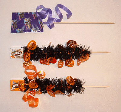 b) ahora que tenemos piezas de caramelo a palos. El siguiente paso es decorar los tallos de flor de caramelo. Enrolle la mayor parte de los tallos de flor de caramelo con guirnalda de Halloween. Cortar un trozo de guirnalda; Fije un extremo de la misma en el stick derecho bajo el caramelo con un poco de pegamento caliente. Envuelva la guirnalda por el palillo cubriendo 2/3 de la vara o más; Asegure el extremo de la guirnalda con un poco de pegamento caliente. También puede atar un pedazo de cinta que se encrespa sobre la guirnalda.