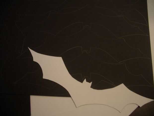 Use un lápiz para trazar el contorno del murciélago en el papel negro. Tratar de conseguir tantos esquemas en una hoja como sea posible. Luego corte los murciélagos.
