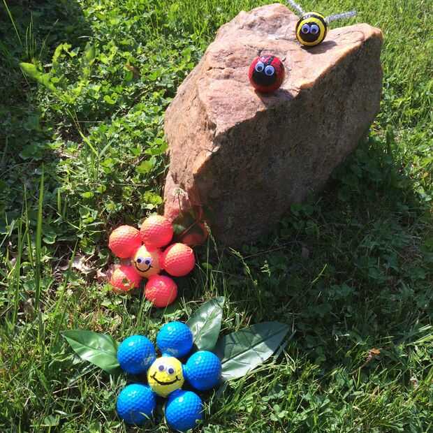 Mi Nannie y emergente se casó hace 50 años este mes de agosto. Va a dar a estas decoraciones como su aniversario presente porque es un poco de cada uno de ellos... Bolas de golf y jardines de flores en el suelo (jaja!!)