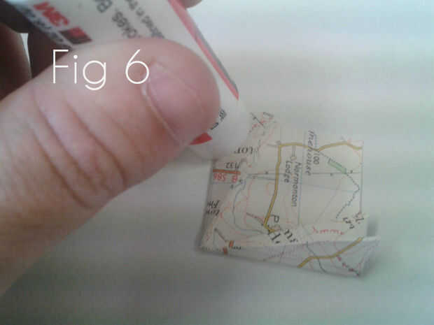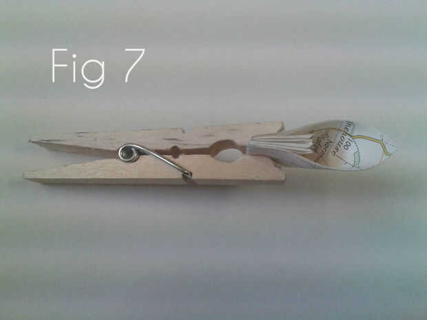 A continuación, doblar cada aleta en dos (Fig. 5). Agregar pegamento a una de las dos nuevas superficies (Fig. 6) y gire el papel alrededor de las dos nuevas superficies a. Utilice una clavija de ropa o un clip para asegurar los dos juntos hasta que el pegamento seque (Fig. 7).