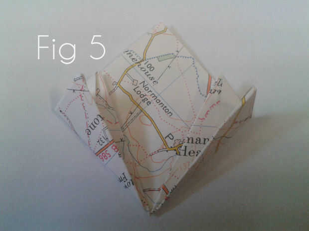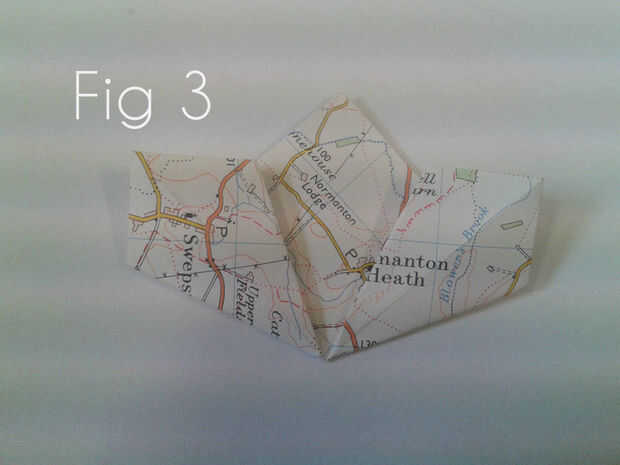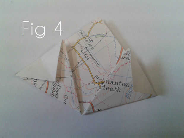 Uno de los puntos de pliegue en el pliegue que acaba de hacer y sqaush abajo, por lo que los dos pliegues alinean (Fig. 3). Doble las puntas de las aletas de nuevo hacia abajo para que alinee con el borde de la hoja (Fig. 4).