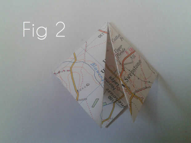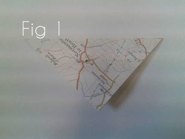 En primer lugar, doblez que cuadrado por la mitad diagonalmente, con motivos secundarios, para que tenga un triángulo (Fig. 1). A continuación, doble los puntos en cada extremo del borde largo hasta el tercer punto (Fig. 2) - entonces despliegan otra vez.