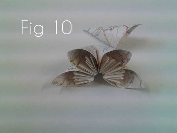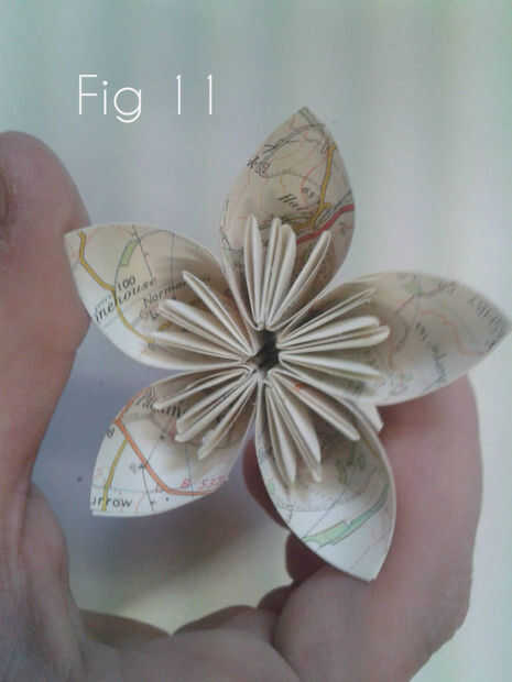 Una vez que tienes tus cinco pétalos y el pegamento esté seco (Fig. 8), quitar las pinzas y empezar a unir las flores como se muestra (Fig 9 y 10). Una vez que los cinco se pegan, tiene una flor! (Fig 11).