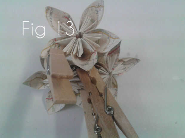 Encolado de la columna vertebral de dos pétalos en una flor. Pegamento para las espinas dorsales de dos pétalos de otra flor, para que las puntas de cada pétalo alinean perfectamente. Coloque pegamento hacia abajo de la espina dorsal de tres pétalos de una flor tercera y la ranura esta junto a los dos que ha pegado. Sujete todas las piezas pegadas con pinzas mientras se secan. Una vez seco, siga el mismo proceso para colocar las restantes tres flores.