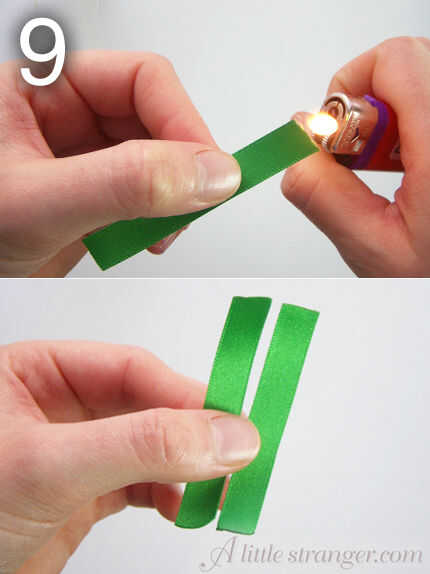 9) corte dos pedazos de cinta un poco más larga que la altura de la cabeza. Selle los extremos pasando rápidamente a fuego sobre ellos.