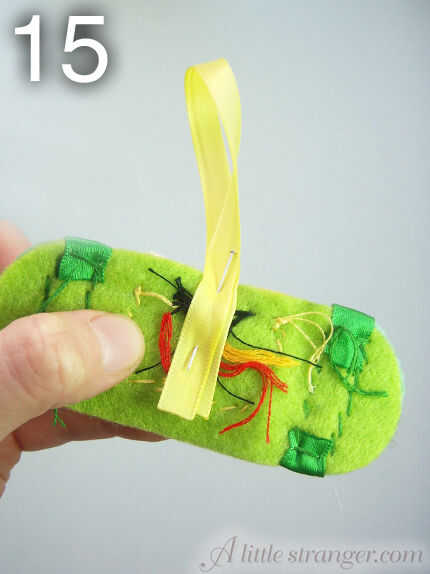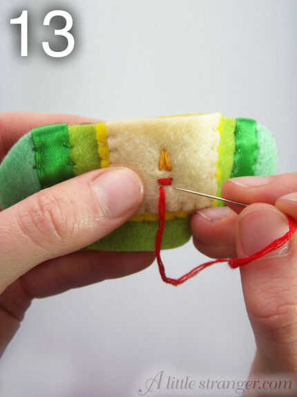 13) Utilice un hilo de bordar rojo coser en la boca. Hacer tres puntadas cada vez más más pequeños uno debajo del otro.