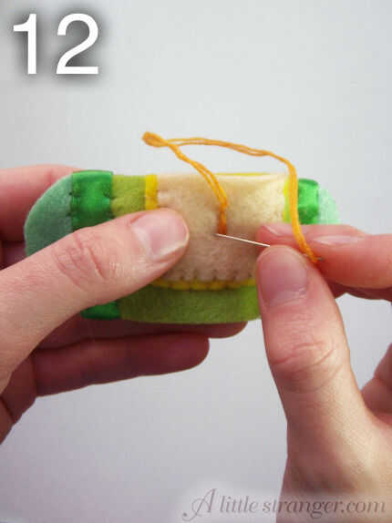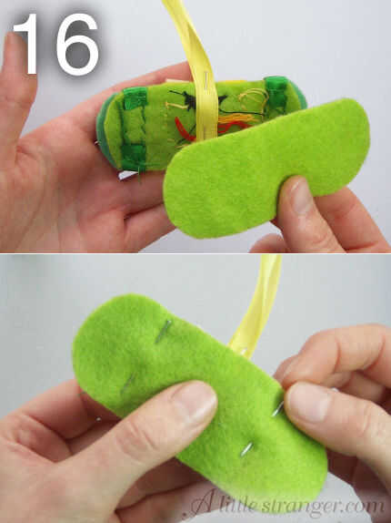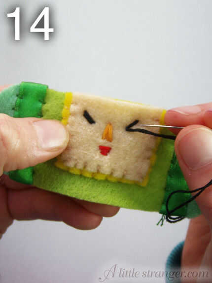 14) utilice un hilo de bordar negro para coser en los ojos. Hacer que cada ojo de dos puntadas inclinadas juntos.
