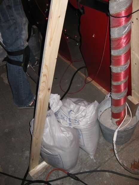Hicimos esto años Mostrar bastante plana porque estábamos tratando de ajustar una gran cantidad de elementos en un espacio muy pequeño.  Para montar el árbol les atamos directamente a algún marco de pvc que construimos para una pantalla de cine.  El pvc es hundido en cubos de hormigón para evitar desgracias.  Luego agregamos algunos sacos de arena en la parte trasera donde construimos algunos refuerzos.  Atornillan simplemente del frente directamente en los montantes de pvc.  Usted podría utilizar el mismo método o cualquier método que funcione mejor para su ubicación.  Es que la mejor parte de todo ello es completamente adaptable a cualquier situación con un poco de creatividad.