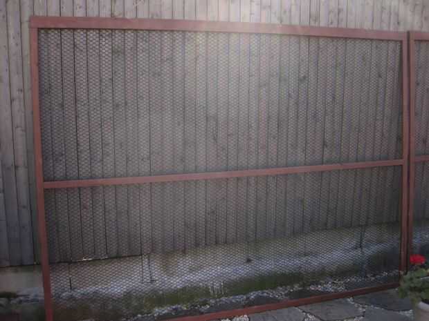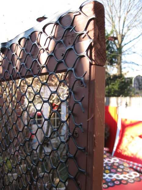 Pintura de aerosol el bastidor antes de colocar el alambre de pollo de plástico. Es importante pintar los marcos para que la humedad no deforme la madera. Usted puede elegir cualquier pintura que se mezclará con el entorno. Se utilizó una cartilla marrón porque iba contra una casa de ladrillo rojo amarronado. Déjelo secar.