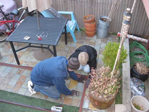 Coloque el marco seco hacia abajo. Ponen el alambre de pollo de plástico en la parte posterior a lo largo y empezar a grapar sobre cada 6 pulgadas. Cuando usted llega a su fin corta con tijeras y hacer la siguiente sección. Cuando termine de cortar en el borde de la madera y está listo para la luz de la cuerda.