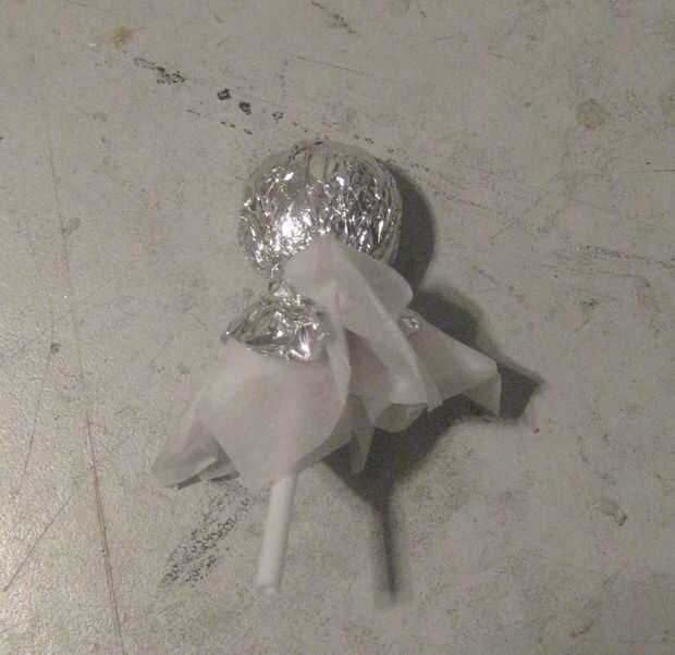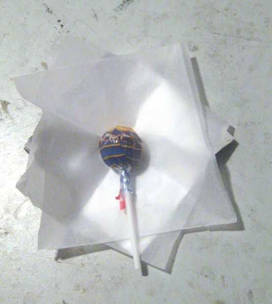 Hay 2 hojas de tejido y 1 de papel de aluminio, todo en un ángulo entre sí, aplastado por el chupa chup.