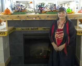 Esta es la zona de mostrador (recepción) en el campus de la Universidad donde trabajo. Halloween no es generalmente un gran problema en Australia, pero pensábamos que tendríamos un buen rato el año pasado. Hay un carro de zombie en un ataúd hecho e