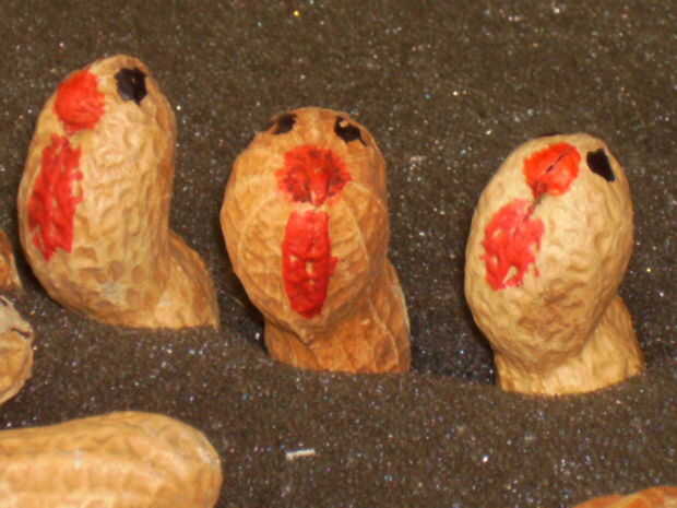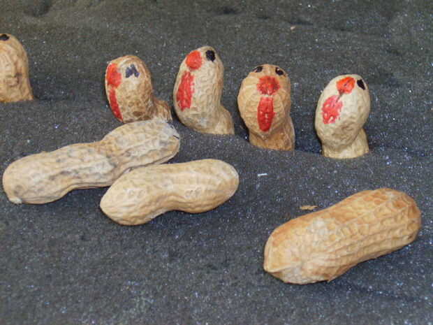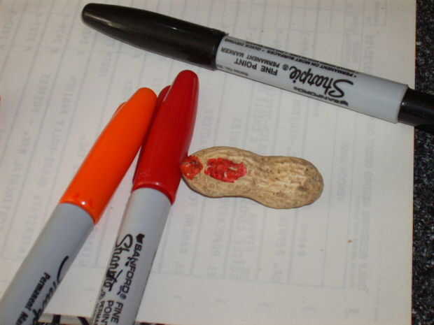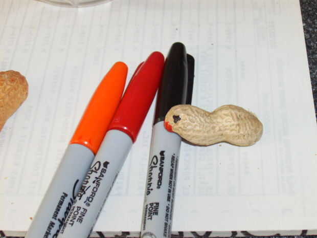 Primero dibujar una cara simple en el maní, si te fijas bien en el cacahuete puede fácilmente decidir donde será el pico.