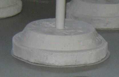 No te preocupes hoyos en el cemento, usted será cubriéndolo para arriba. Pintura de aerosol las bases blancas para ocultar cualquier color a través de la tela. Cortar un círculo de fieltro del mismo tamaño que la base, luego pégalo en la parte inferior de la base para proteger la superficie de la mesa o mantel que se va a.