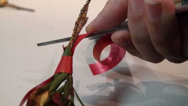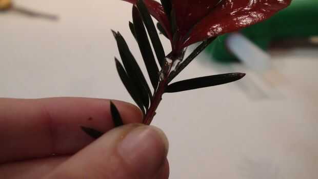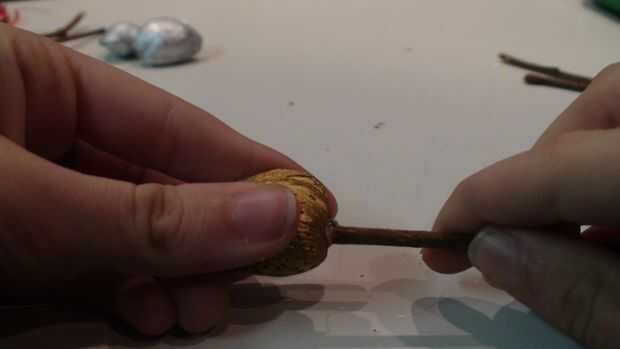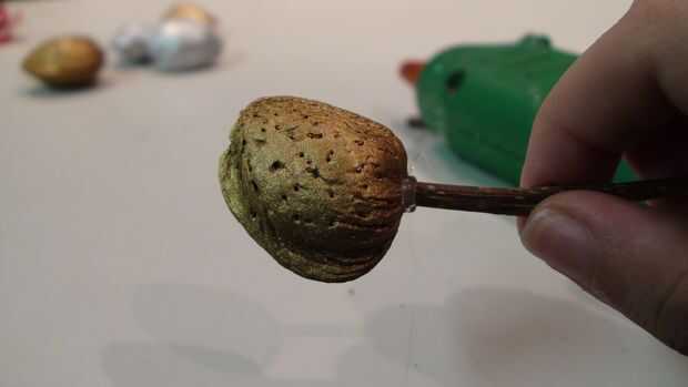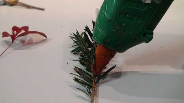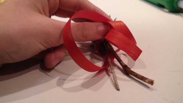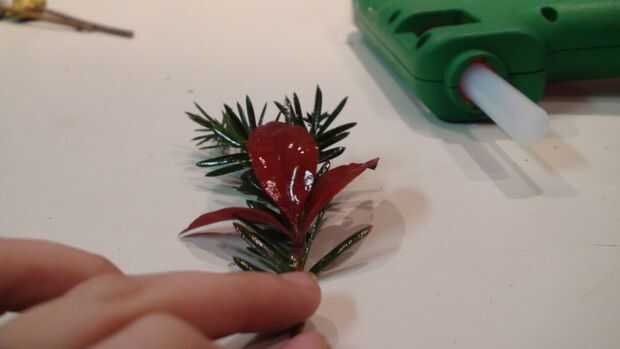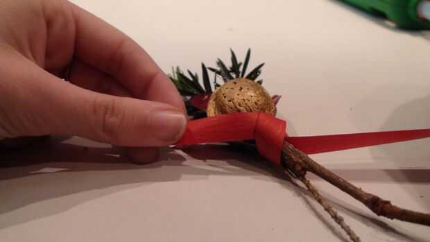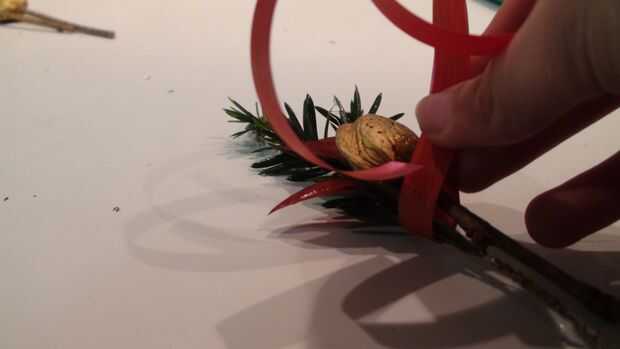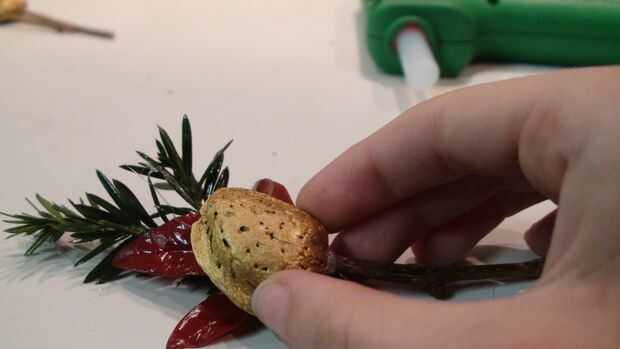 Primero pegue la ramita a la almendra con pegamento caliente. Luego tomar la rama con las hojas verdes pequeñas y puso algun pegamento para pegar las hojas rojo allí. Después de la puesta más pegamento sobre las hojas y pegamento de la almendra. Para terminar de cortar un trozo de cinta y poner junto con un nudo. Con las tijeras enrollamiento de la cinta y que ha terminado.