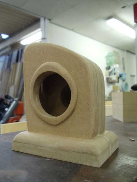 Cuadro 3 muestra la parte frontal de la radio cuando totalmente en forma. Utilizando el taladro del pilar, un agujero con un radio de 27,5 mm en el centro del frente del radio. Utilizando el 70x80x10mm MDF dibuje un círculo con un radio de 27.5 en el centro y otro de 35mm sobre el mismo origen. En la parte superior e inferior del círculo exterior cuidadosamente mano dibujar la forma del anillo. Cuando esto esté hecho, usar la máquina que enarena para crear la forma del anillo exterior. el anillo todo por que es muy suave aunque permiten la parte superior del anillo sobresalga más que el resto de la arena de la mano. Péguela a la parte frontal de la radio.